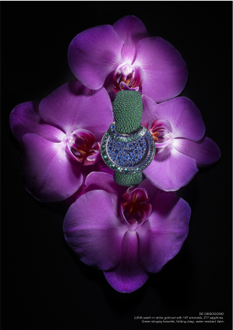 DE GRISOGONO LUNA watch in white gold set with 147 emeralds, 217 sapphires. Green stingray bracelet, folding clasp, water resistant 3atm
