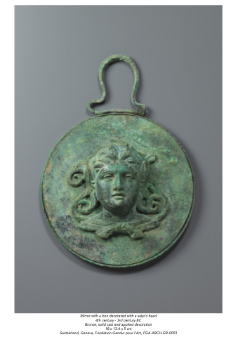 Mirror with a box decorated with a satyr’s head 4th century - 3rd century BC Bronze, solid cast and applied decoration 18 x 13.4 x 5 cm Switzerland, Geneva, Fondation Gandur pour l’Art, FGA-ARCH-GR-0093