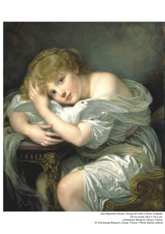 Jean-Baptiste Greuze, Young Girl with a Dove, undated. Oil on wood, 64.4 × 53.3 cm. Chartreuse Museum, Douai, France. © Chartreuse Museum, Douai, France / Photo Daniel Lefevre