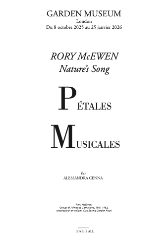 GARDEN MUSEUM London Du 8 octobre 2025 au 25 janvier 2026 RORY McEWEN Nature’s Song PÉTALES MUSICALES Par ALESSANDRA CENNA Rory McEwen, Group of Allwoods Carnations, 1961-1962, watercolour on vellum, Oak Spring Garden Foun LOVE IS ALL