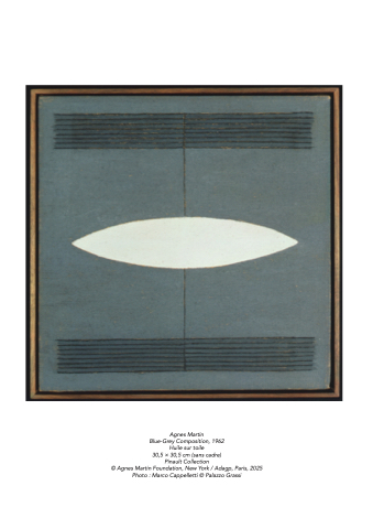 Agnes Martin Blue-Grey Composition, 1962 Huile sur toile 30,5 × 30,5 cm (sans cadre) Pinault Collection © Agnes Martin Foundation, New York / Adagp, Paris, 2025 Photo : Marco Cappelletti © Palazzo Grassi