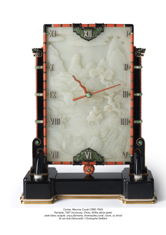 Cartier, Maurice Couët (1885-1963) Pendule, 1927 (monture), Chine, XVIIIe siècle (jade) Jade blanc sculpté, onyx,diamants, émeraudes,corail, nacre, or, émail © Les Arts Décoratifs / Christophe Dellière