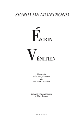SIGRID DE MONTROND ÉCRIN VÉNITIEN Photographe VÉRONIQUE MATI Par MICHA CHRISTOS Sincères remerciements à Eric Bonnet BE IS BEAUTY